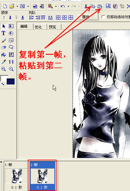 当然为了美观还可以多添加几桢,一定要添加桢。再复制第一桢或者复制第二桢。一般是1,3,5桢......相同. 2,4,6桢......相同。各帧的“延迟”根据需要设定。保存图片。