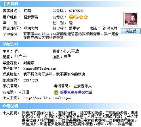 头像是传奇的宣传画,住在玛法大陆盟重省沙巴克,连邮编都,,,333:333?盟重安全区的座标,哈哈啊。。。