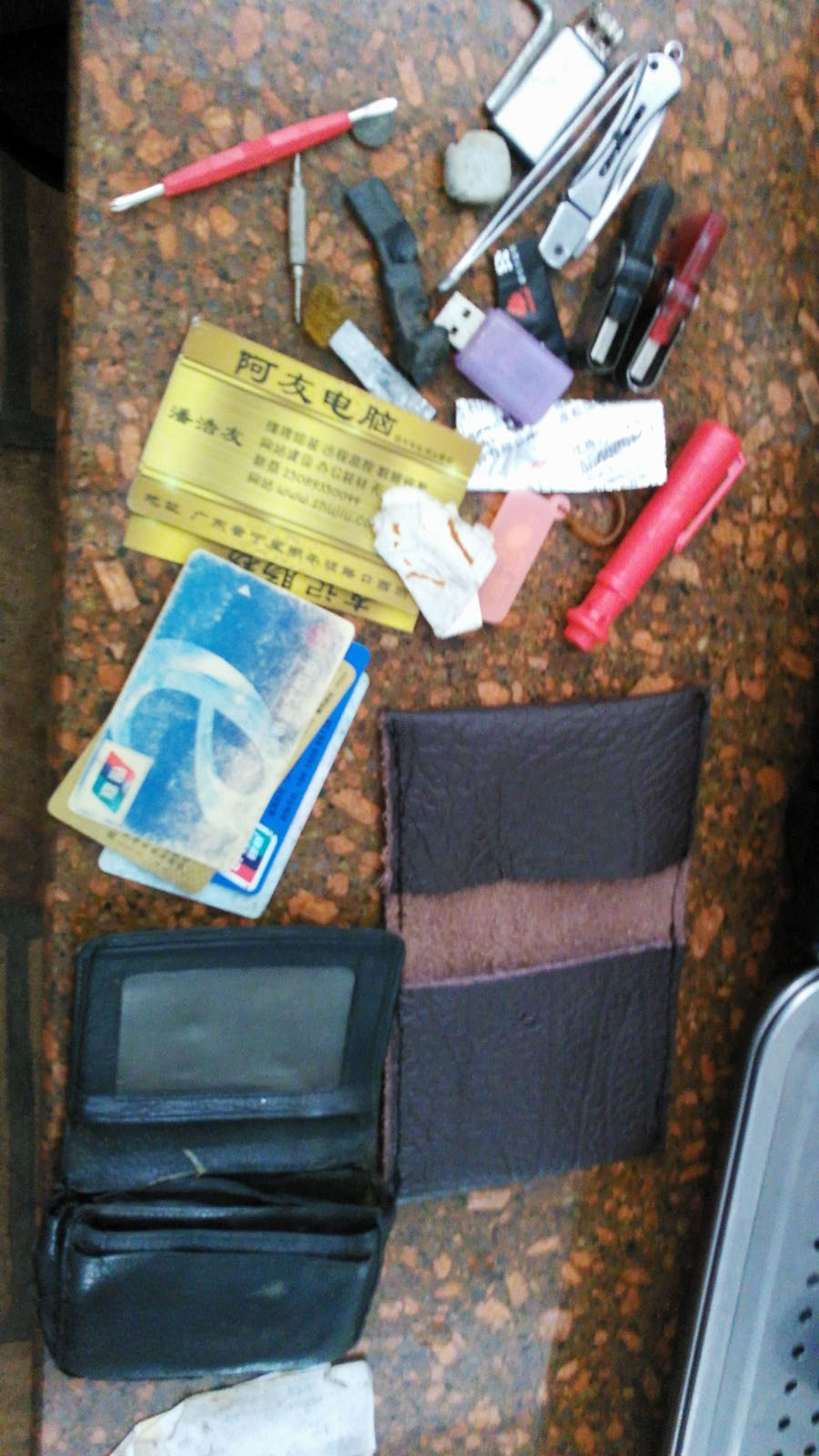 巴掌大的包里,装着U盘四个(放资料装系统驱动之类,量产两个,UD分区两个),读卡器一个,加密狗一个,小刷子一把(清理灰尘用)小镊子一把(处理卡纸、键盘弯针、电源绿色和黑色接通等,其实这是女人修眉用的。。。)像皮擦一个(清理金手指用)小磁块一个(给锣丝刀加磁)锣丝刀一个(可折叠,其实是电笔)小小锣丝刀一个(收集到现在还没用到过,实在太小了)笔一支,喇叭一个(修机很有用)手链一条(上面的三角铁是弹吉它用的)还有夹在卡片中间的锈花针一个(挑CPU脚、捅光驱用的)回形针(捅光驱、电源绿色和黑色接通)