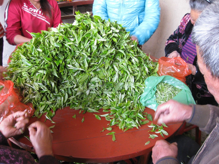 图示是典型茶农采下的茶青,芽,一芽一叶,一芽两叶,叶都要分拣开来,用于生产不同茶品。