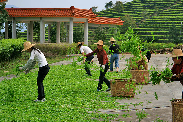 刚采摘下来的鲜叶水分含量高达75%~80%,萎凋主要目的在于减少鲜叶与枝梗的含水量,促进酵素产生复杂之化学变化。萎凋及发酵过程所产生的化学作用牵涉范围甚广,与茶叶香气、滋味、汤色有绝对相关。鲜叶采摘后,应立即摊开即置,避免堆置捂热。