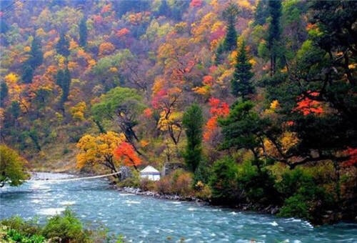 金秋是米亚罗的四季之最,10月是米亚罗的全年最美,3000多平方公里的山林,被点染上了十几种绚丽的色彩。秋风吹过,河谷两岸密林中的枫树、槭树、桦树、鹅掌松、落叶松等渐次经霜,树叶被染成绮丽的鲜红色和金黄色,蓝天白云、山川河流共同勾勒出一幅醉人画卷。