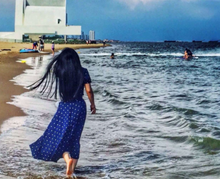没有闹市的喧嚣,没有海滨吵闹的人群,那么静谧,偶尔听到有几个游客的声音,也许是怕吵到这位安静的少女,所以都是轻轻的交谈,只有海风轻轻地吹过耳际。
