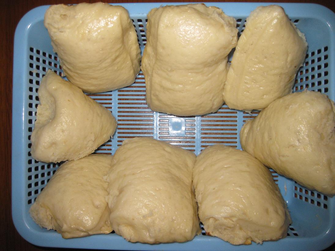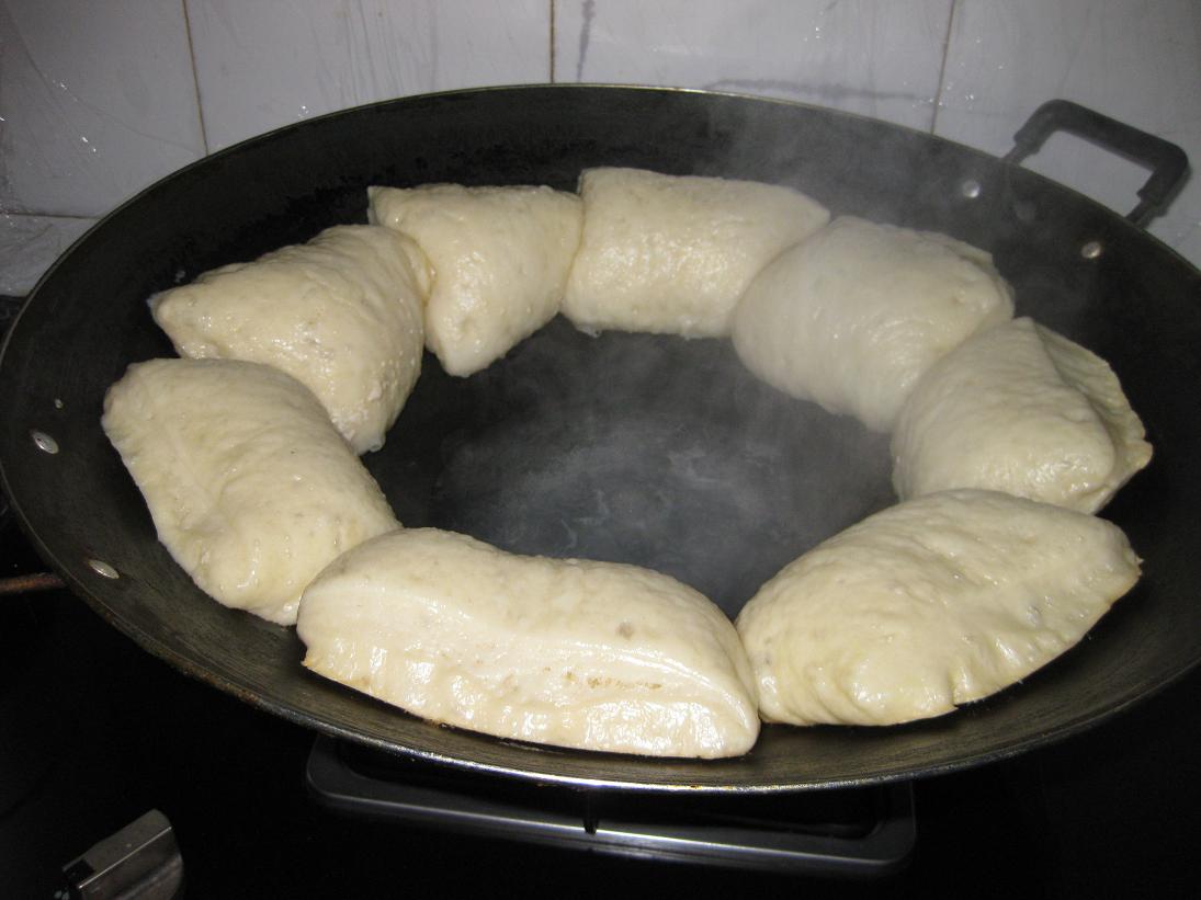 之后拿出大部分面团(小部分保存起来做酵母菌块),切块贴在我家的大锅中,锅底放水,用水蒸气煮熟