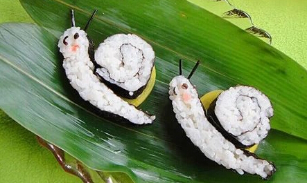 9)将寿司组成小蜗牛的形状,最后贴上海苔剪的眼睛、和蕨根粉丝的触角,下面垫上一片大根。