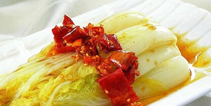 制法:将白菜拣去黄帮烂叶,去根洗净,直刀切三分宽,八分长块,放在开水中焯熟捞出晾冷控干,辣椒切成细丝待用;撒上精盐,把白菜拌匀,起锅把椒油加热,放上辣丝、葱丝、姜丝、白糖醋、酱油、味精等调料炝上即成。红白相间,香辣多味。