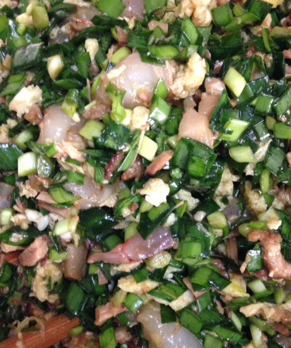 原料,韭菜,红烧肉,虾仁,鸡蛋,盐,料酒,姜,香油