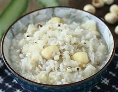薏米50克,莲子(去心)30克,百合20克,先煮烂,再与粳米50克同煮粥用适量红糖(或蜂蜜)调味食用。有健脾祛湿,润肺止泻,健肤美容作用,适用于大便溏烂,下肢湿疹,面部座疮等症。