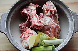 1、棒骨和鸡架清洗干净、部分葱姜切片,一起放入砂锅中,砂锅中加入清水,放火上小火2小时,熬成高汤