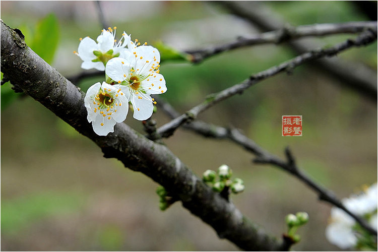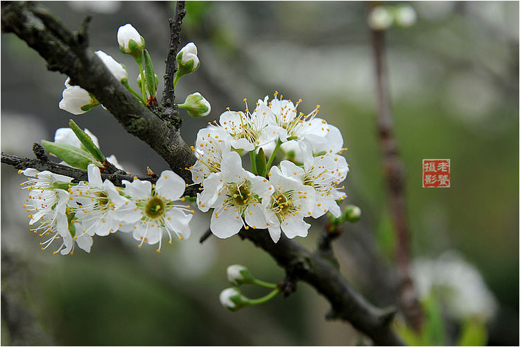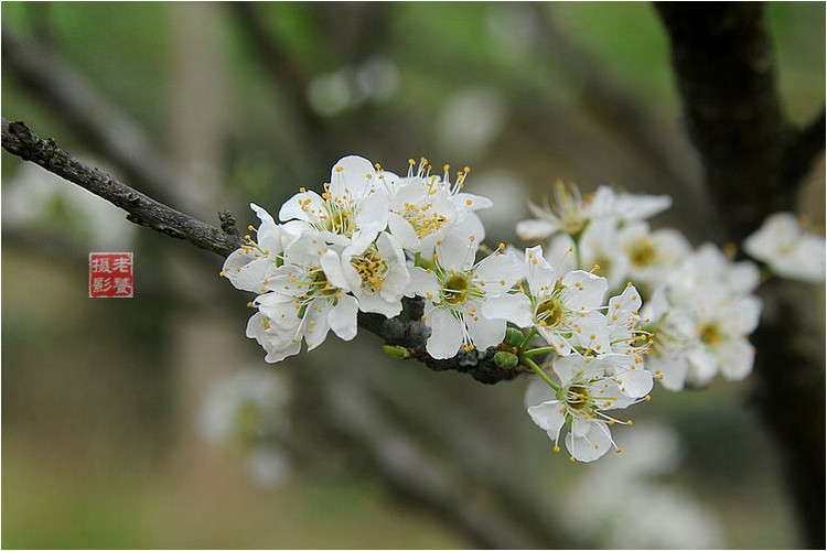 李,又名郁李、玉梅,古称嘉庆子,为落叶乔木,花期为4~5月,白花,虽小而繁茂,素雅清新。