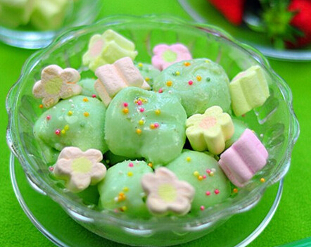 7)放在冰激凌碗中点缀上彩色棉花糖即可。