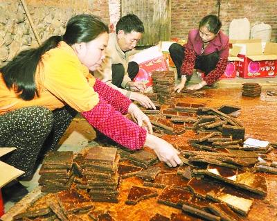 等干透,只要将木条垫在底下再将席子轻轻一抖,糖块就变成了一块块四方方的板糖,大小匀称,厚薄