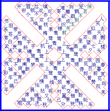 这幅图够生动的了,看上去两只鸳鸯翩翩起舞,多么引人喜爱。这幅图可读出七言绝句八首,上下四首,从“难”、“嗔”、“分”、“秋”四个字读起,读到“年”、“来”、“书”、“人”四个字为止;左右四首,从“年”、“来”、“书”、“人”四个字读起,读到“难”、“嗔”、“分”、“秋”四个字为止。交叉斜读,每首第二句及第四句的第一个字均借上句的末尾一个字。全图可读成七绝律诗八首。