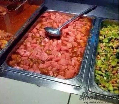 西瓜炒肉这道菜实在是“丧心病狂”,“高校食堂菜是黑暗料理界的先锋。”“实在想不明白是怎么想出来的。”“食堂菜系,吓哭。西瓜君,你这是怎么了,惹谁了啊。”“丧心病狂!!是哪个蛇精病食堂!!!”