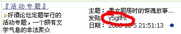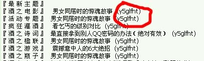 进入www.shujiu.com主页面,由于书酒论坛的流量还算不错,结果吸引来很多发广告的机器人,这些毫无意义的英文与数字组合或是一些无意义的繁体字用户名,而且贴名是一些很明显的色情广告的,可以不用犹豫,点击其用户名,如图一(机器人,即无需人工注册发贴,会全自动地注册,发贴的一种程序)