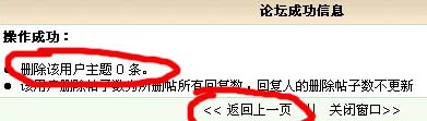 有一些广告机器相当的狡猾,选择在每晚的11点到12点这段时间发广告,如图4,刚才已经删过一次今天该用户的贴了的操作,但是该用户还有7贴未被删除,那是因为我在执行的时候已经是第二天了,你可以点击这图四上面的返回上一页,选择图三的注3,选择为2天,再点执行,这样,就能删去所有该用户的发贴了,一般机器人发贴都会发5至7贴,如果该用户只发了3至4贴,那么,你在执行删除之后,不妨再返回上一页,点图三的注解4,点锁定,以防止该机器人继续发贴