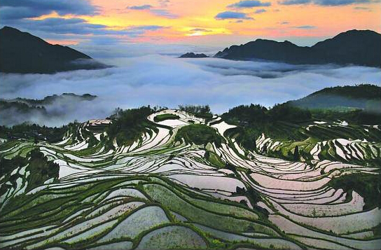 浙江云和梯田。" 云和 " 的字面意思是 " 祥和的云朵 "。1000 多年来,云和以及周边的梯田已经成为当地农民们赖以生存的家园。层层迷宫似的梯田在海拔 2001400 米不等的山峦里蜿蜒盘旋,最多可叠 700 层。阴雨天气最适于梯田观光,此时河水蒸发的雾气,笼罩在梯田上方,随风轻轻浮动,形成海市蜃楼般的农田美景。门票:80 元 / 人。云和县位于丽水市西南 67km 处。在丽水火车站可以搭乘到云和的往返班车。