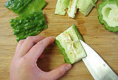 3、苦瓜剖开,挖去瓜籽和白色内膜;
