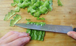 4、斜刀将苦瓜片成教簿的小片;