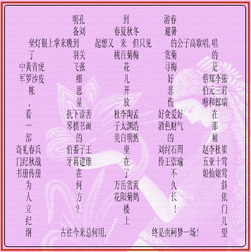 到春来桃花儿开放,杜子美坐在了万花楼上,但只见游春的公子高歌唱:唱的是蔡伯 喈在那厢,赵五娘斜依门儿望。好悲伤,好酒的刘伶不久长。又想起,孔明到晚来掌上银灯,坐上了中军帐,看一部奇门书,为人立纪纲。细思量,抚琴的伯牙在何方?古往今来总何用终是南柯梦一场!