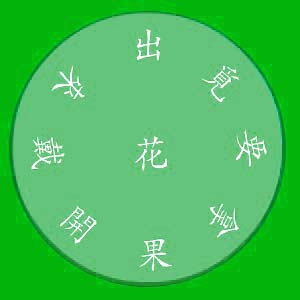 先将“出、觅、要、拿”拆开,再与花字串读。读为: