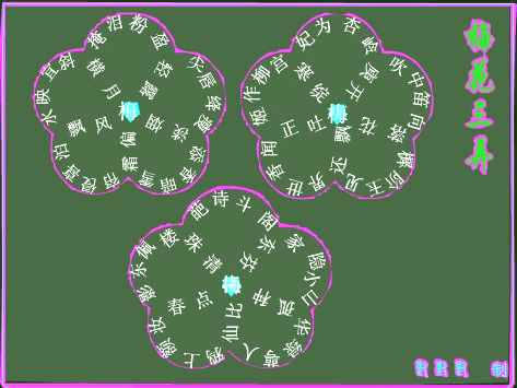 读法:从花心处“梅”字开始,沿花瓣边缘作逆诗针方向转动,一个花瓣转出一句诗,每一弄是五句,恰似一朵梅花瓣数。每首以梅为首字,恰似每片花瓣都是从花心长出似的。           读为: