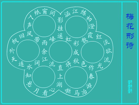 读法:诗中某些字要重复读,形成连珠,要一个圈字挨一个圈子读,读成蝉联式连环七绝三首。读为: