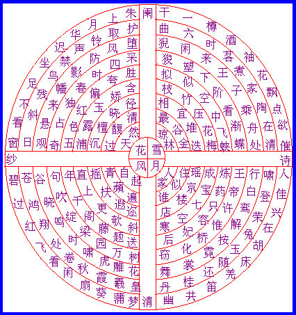图可读成七律诗四首。图中心的“风”、“花”、“雪”、“月”四个字分别为四首七律诗的题目。