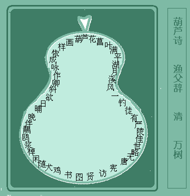 葫芦诗《渔父辞》是这样的:葫芦内藏有四十九个字,可以读成一首七言律诗。它的读法是:从“芦花菖叶满平湖”读起,下句首字均借上句末字,至“依样画葫芦”止。
