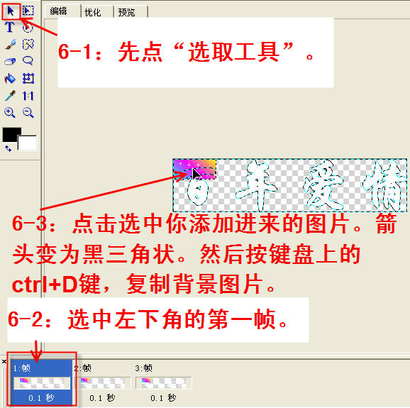 当然为了美观还可以多添加几桢,一定要添加桢。再复制第一桢或者复制第二桢。一般是1,3,5桢......相同. 2,4,6桢......相同。各帧的“延迟”根据需要设定。保存图片。