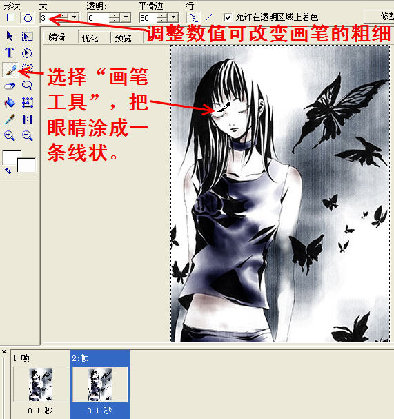 点“帧”--“帧属性”。把第一桢的“延迟”设为30秒, 第二桢的“延迟”设为为10秒。眼睛就可以眨起来了。