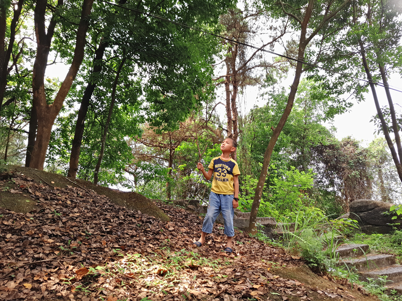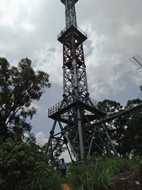 努力爬了半天,边休息边鼓励孩子,终于走到了最高点,揭西电视台的电视塔