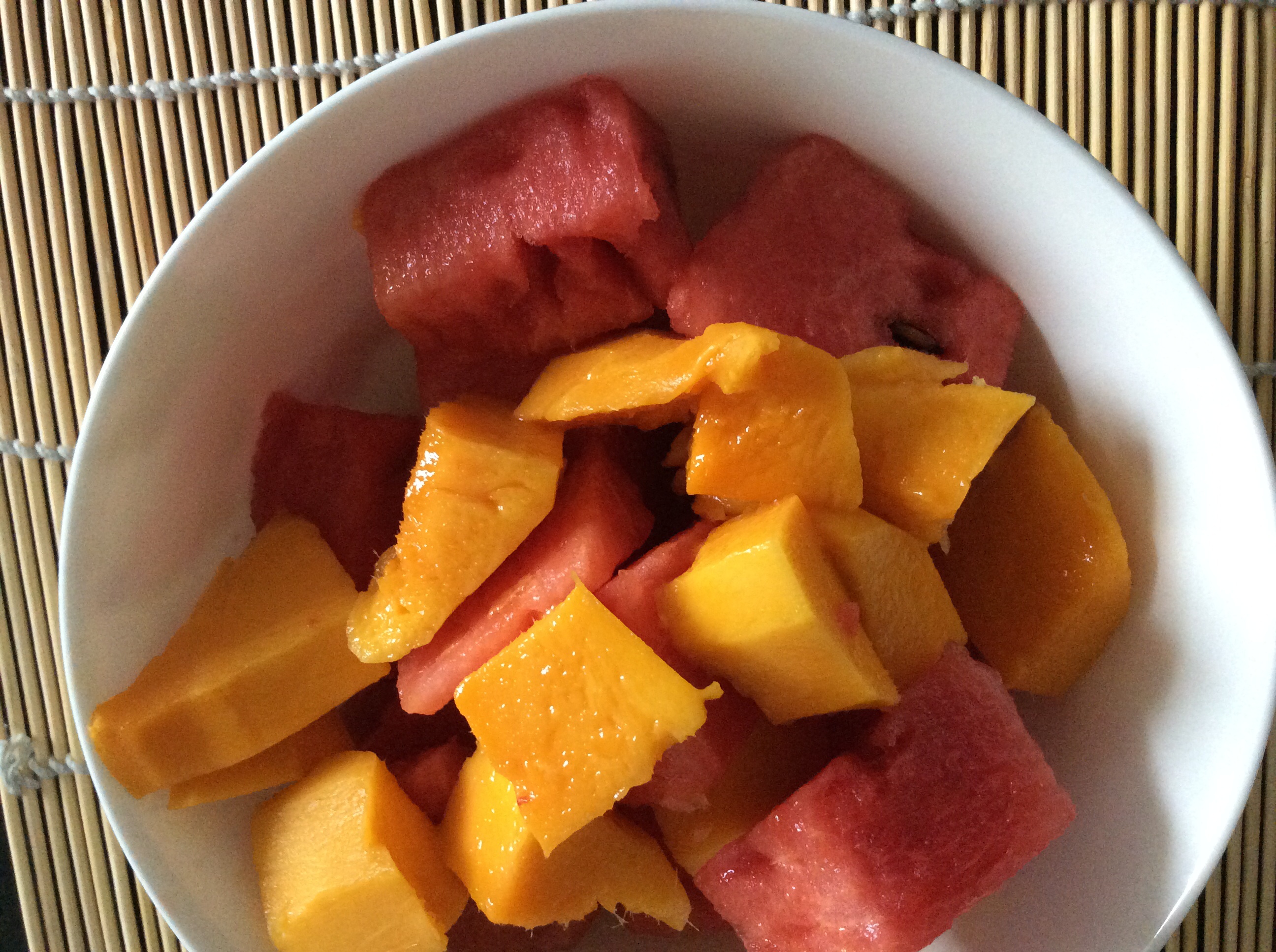 把西瓜去皮切成小块,然后把芒果去皮、去核切成小块