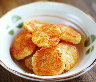 2、牛奶和土豆泥混合拌匀,土豆泥做成大小均匀的饼,放入加了橄榄油的平底锅,小火煎至两面金黄即可。