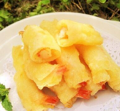3.春卷皮对半切开,取半张春卷皮,放上土豆泥和虾,卷起来,放油锅里用中高火炸2、3分钟即可。