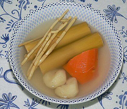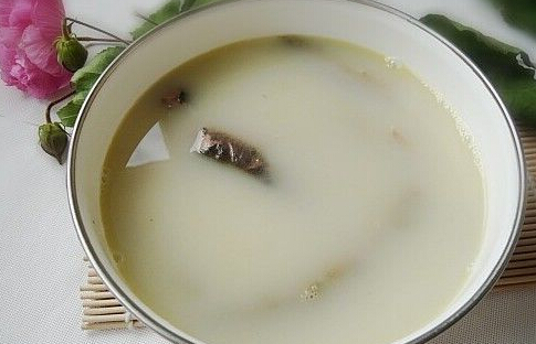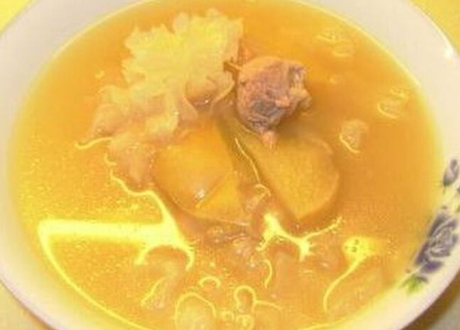 3、做法:起锅略煎鱼骨,红萝卜去皮切片略微爆炒,然后加水,滚十分钟后换落汤煲去煲,加黄豆和雪耳。汤直接饮用,或用来煮面煮粥。
