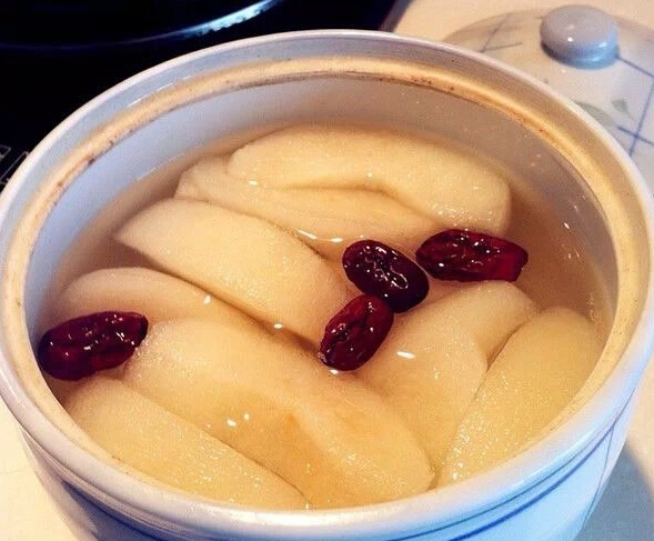 3、做法:将雪梨切开两半,中间挖空,将象牙丝放中间。隔水炖。喝水,也可连肉吃。