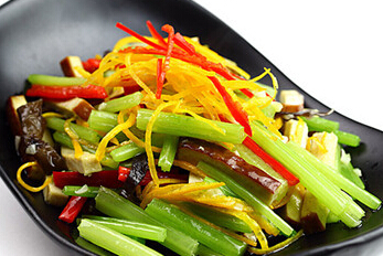 原料:橙皮50克、香芹80克、熏干100克、盐2克、姜3克、蒜3克、水淀粉10克、白糖2克、油5克、胡椒粉1克