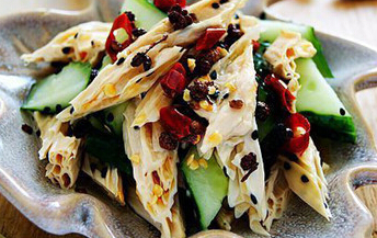 原料:腐竹、黄瓜、油、盐、醋、味精、花椒、干辣椒、生抽、香油、芝麻、白糖