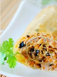 3. 把馅料平铺在豆腐皮上,卷成卷,放在盘中,上蒸锅大火蒸15分钟,取出切厚片,可调配自己喜欢的蘸料一起享用。