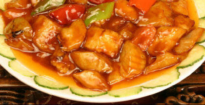 (3)勺内留少许底油,烧三四成热,放入松籽炒出香味,加葱丁,姜末,蒜片,酱油,汤,盐,味素,醋,糖,料酒,炸好的茄花,烧开,用湿淀粉勾芡, 点香油,装盘即好。