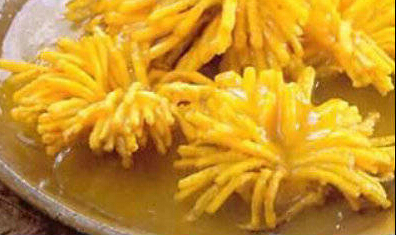 (2)勺内放油,烧六七成热,放入茄花炸成金黄色,捞出沥油。