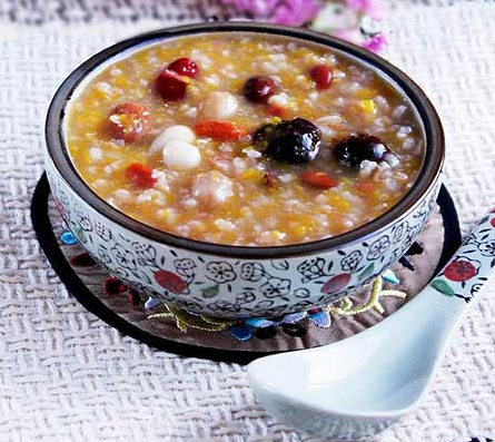 原料:红米、玉米碴、糯米、薏米仁、鹰嘴豆、糙米、大麦仁、桂圆、红枣、百合、菱角米、白芸枸杞