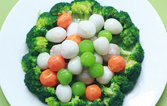 1. 用挖球器将莴笋和胡萝卜挖出球,将鹌鹑蛋煮熟去壳;西兰花洗干净切小朵焯水,摆在平盘中装饰一圈。