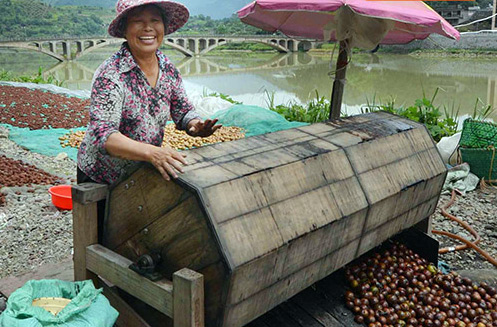 制作李干要选用九成熟的李果。李师傅先将鲜果洗净,接着将果子装入摇李机中“摇青”。摇李机是直径0.6米,长一米多的木制圆柱型滚筒。“摇李可有讲究,先放入水、再放进草木灰,利用草木灰的摩擦力除去果皮上的果粉及蜡质,不仅让水分蒸发,也促进盐份渗入果肉。”李师傅一边告诉我们,一边手脚麻利地转动着摇李机。差不多过了一刻钟,他将摇李机上木板一拔,“哗”,李子纷纷滚落水池里。