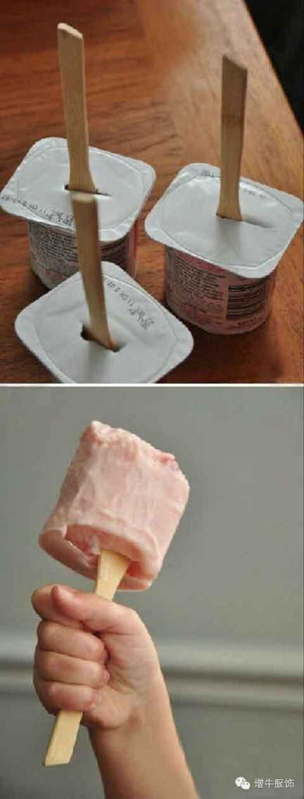 盒装酸奶顶部开一小口,放入冰棒棍放入冰箱冷冻冻硬,吃的时候撕掉表面包装就可以吃了