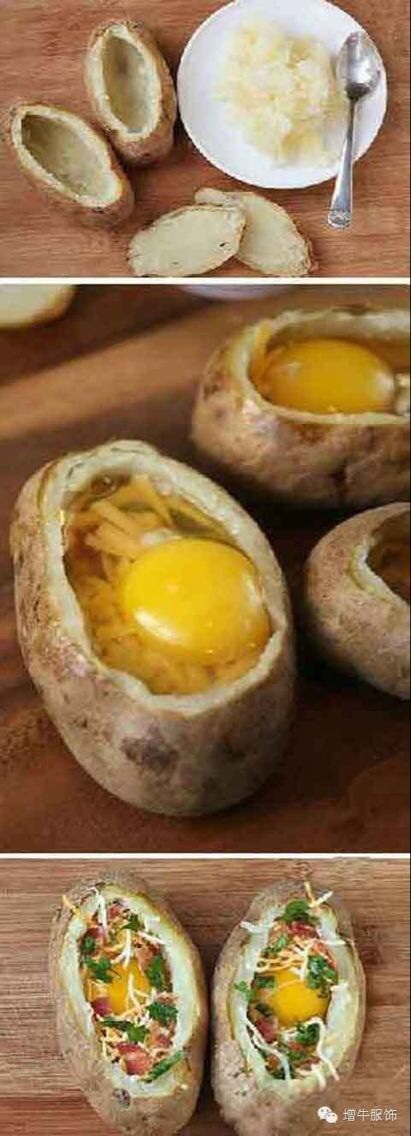 把土豆洗净蒸熟,挖空后塞点喜欢的蔬菜、培根、芝士之类的,打入一个鸡蛋,在放入烤箱烤熟,美味极了