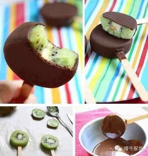将猕猴桃切片,然后裹上巧克力酱放入冰箱冷冻,接下来就尽情享受美味吧