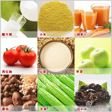 ①营养酸牛奶:增食欲促消化 ②小米:富含VB,不饱和脂肪酸 ③胡萝卜:增强免疫力 ④西红柿:含VC丰富 ⑤豆浆:物美价廉的滋补饮料 ⑥苹果:含锌丰富 ⑦蘑菇:净化血液中的毒素 ⑧苦瓜:增强免疫细胞活力 ⑨黑木耳:净化肠胃