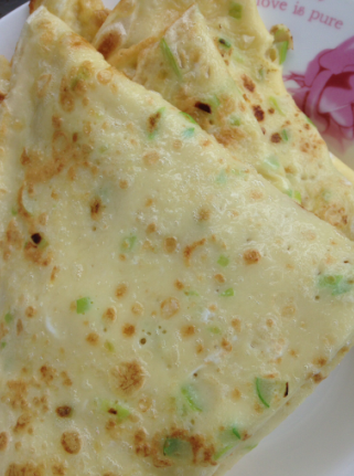 5)饼铛加少许油,把和好的面糊倒入适量,摊成薄饼,两面煎熟即可